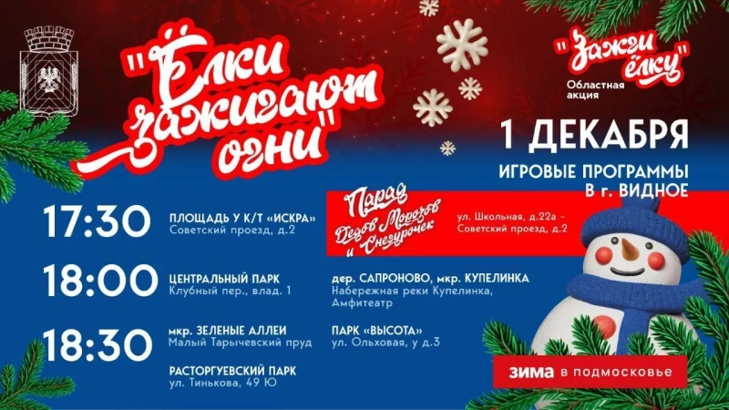 «Шествие новогодних волшебников уже в 10-й раз будет проводиться в Видном в первый день календарной зимы. Оно стартует в 17:30. Жители Ленинского округа в праздничных тематических костюмах под музыкальное сопровождение пройдут к площади у „Искры“, где зажгут огни на главной елке муниципалитета», — рассказали в пресс-службе.